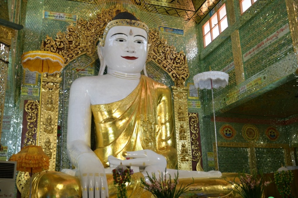 As I travel through Myanmar, I see the same focus on the Buddha. In the rich and ornate Shwegon Pagoda in downtown Yangon, I see actual gold and silver Buddhas. In the halls of Schwedagon Pagoda, I can see the same basic Buddha life scenes on murals just below the hall’s ceiling. I see his birth, his renunciation, his sitting under the Bodhi tree, his fighting Mara, his enlightenment, his evangelizing the Dharma message, his death.