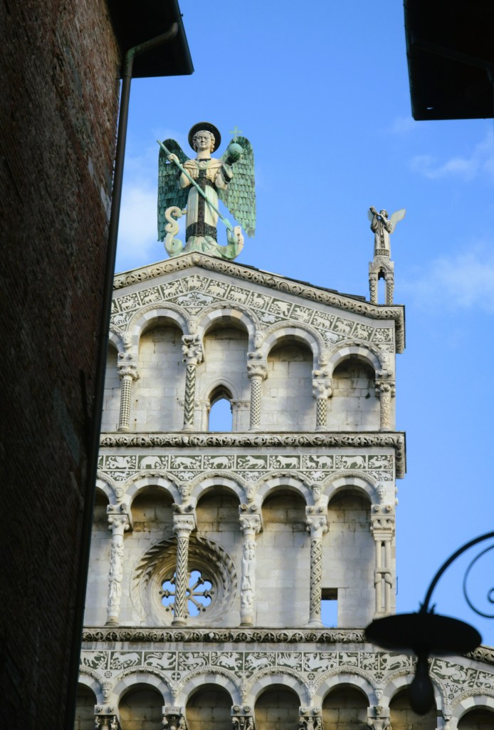 Besides the Cathedral, the Basilica of San Frediano has a striking golden mosaic of Jesus on its exterior front. The Church of San Michelle in Foro has a striking exterior with a narrow facade dominated by a sculpture of Saint Michael slaying the dragon.