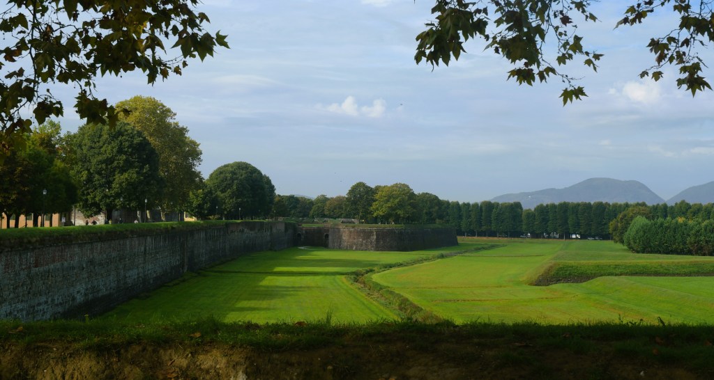 I have a rest day in Lucca. A day for exploring though! At first, I walk the massive, Renaissance city walls. The city walls, 2.6 miles in length, are the second longest in Europe. Since the walls were so successful a deterrent, Lucca was never attacked. These walls are so broad that a “royal” walkway was created on the top of the walls with mature oak, elm, and plane trees shading the path. Even a sculptured figure wants to walk along the walls.