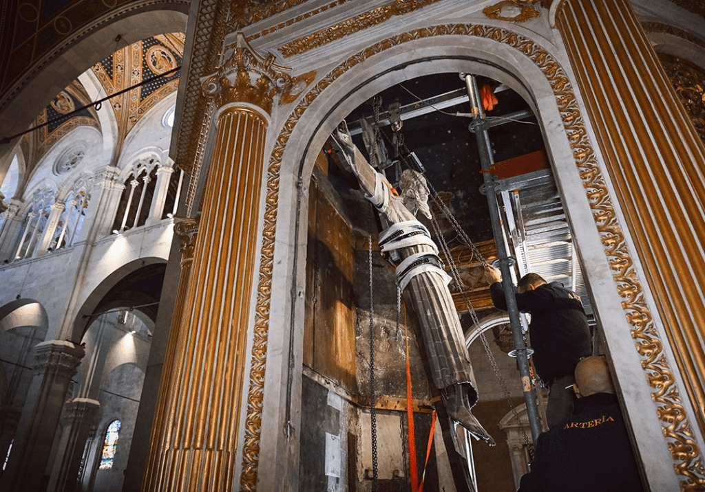 Beginning in September 2022, specialists began a lengthy project to restore the wooden sculpture. Here are photos during the moving of the carving and prior to the move (both photos are copied).