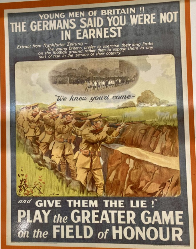 Soccer reappeared in other ways. British posters appealed to young men “to be part of the game.” Both the British and the French to form “pal brigades” which often consisted of men who played for the same club or team.