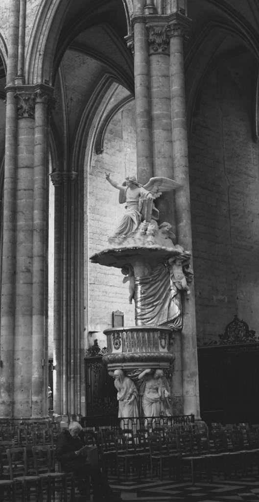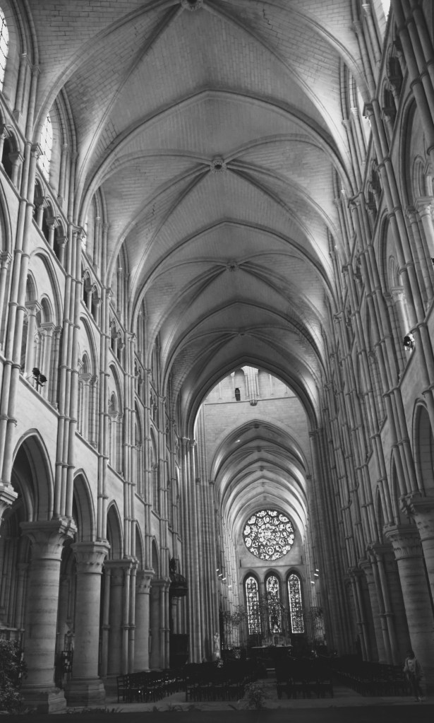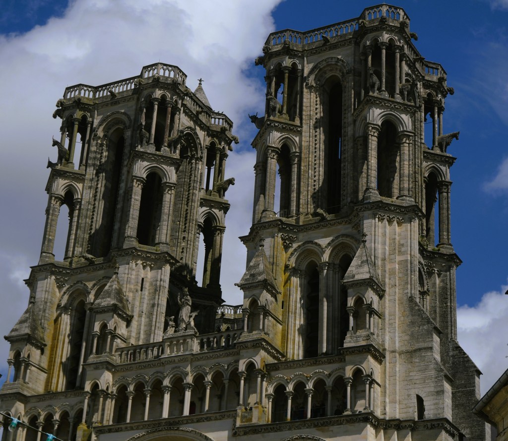 Laon has one of the most impressive settings. On a plateau, the town and cathedral sets one-hundred yards above the surrounding fields. One of the earliest Gothic French cathedrals, and a forerunner to other later cathedrals, this cathedral is extremely quiet during my visit. I love simply sitting in the Cathedral. Like Canterbury and Amiens, I was surprised by the stone’s whitish color.