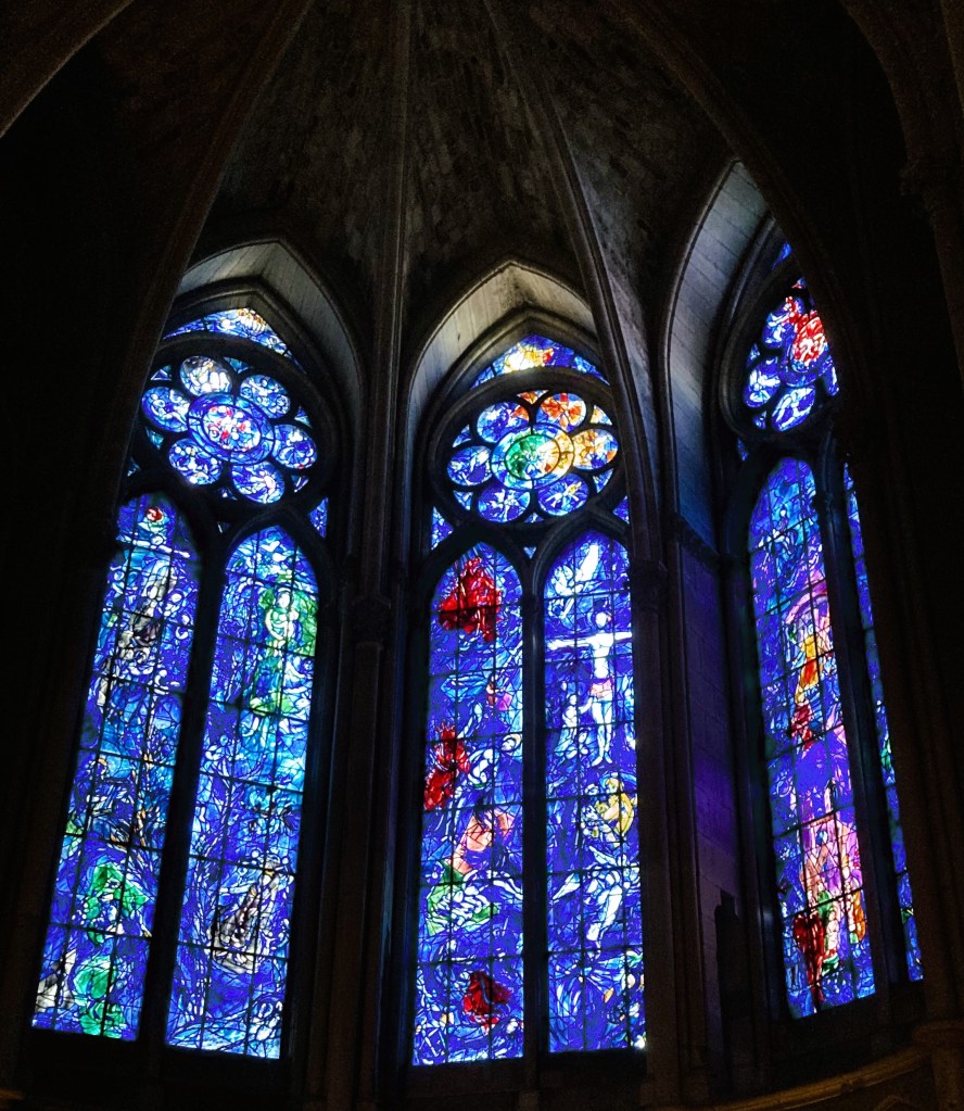 Then, like Amiens, there are hundreds of stone carvings and statues. Above one of the entrances is “The Smiling Angel.” Why is she smiling? The beautiful, timely, and inspiring stain glass. Even the region’s wine-making turned into glass. Most poignant were two chapel sets of abstract stain glass replacing destroyed glass of WW1, both sets donated by German artists and the German government as an act of reconciliation. In the back center Apse, the subdued but striking glass of Marc Chagall. A twentieth century Orthodox Jew turned mystic. Talk about another reconciliation!!