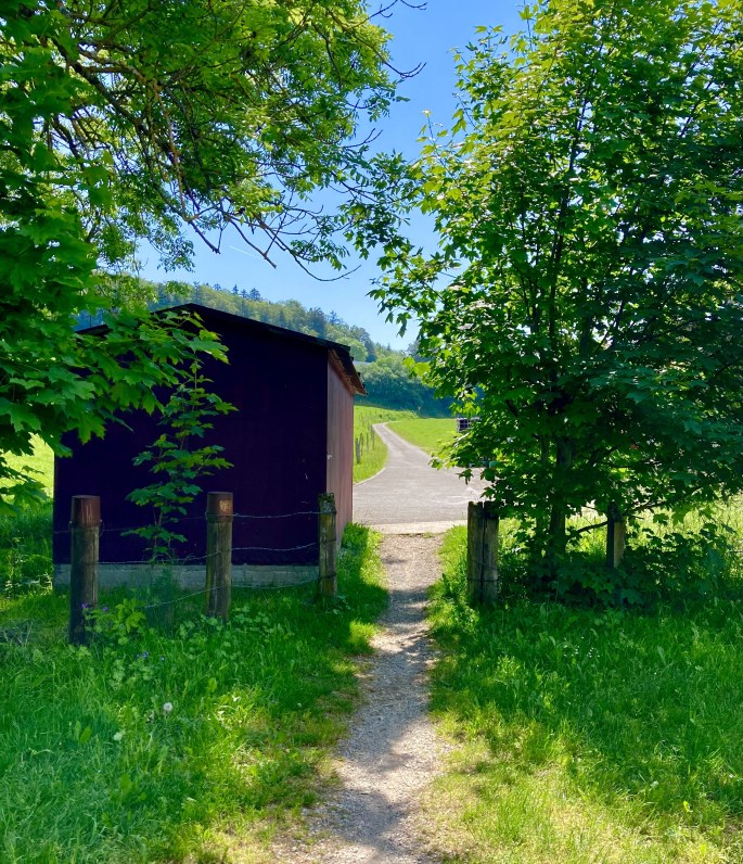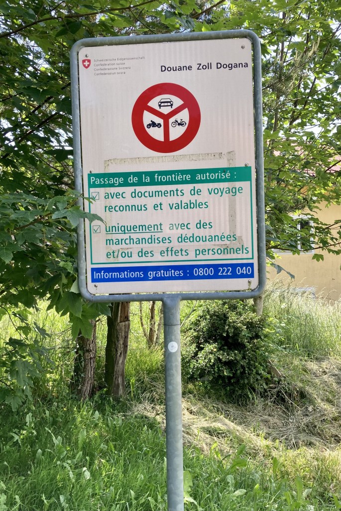 The Via Francigena is simply an opening between a shed and a wood fence. For a flash, I’m back in Sigeric’s period. In the 900’s there would have been few, if any, markers that a person was passing through different political territories. Back in today’s world, we do get such a marker. One doesn’t have to know French to understand that the sign warns the traveler about what one should not bring into Switzerland.