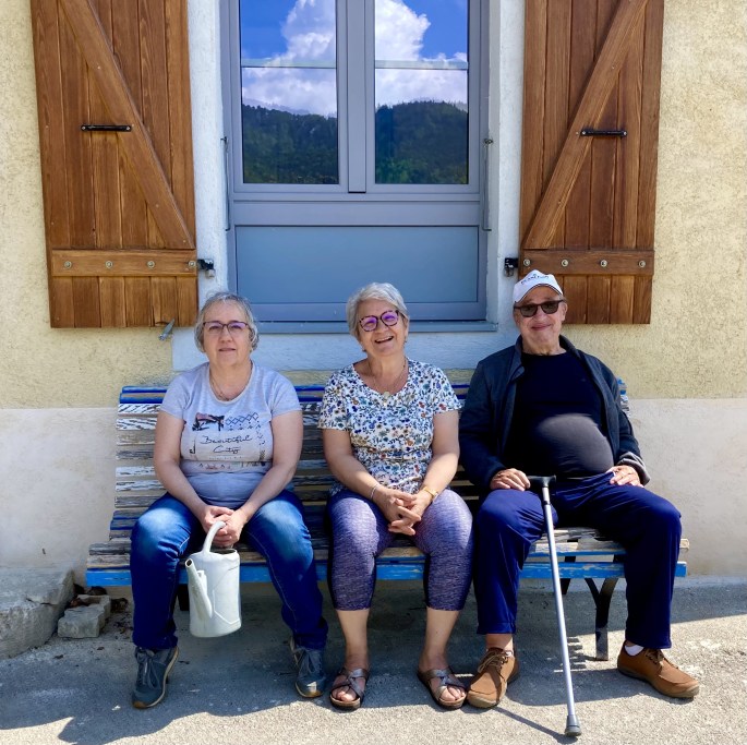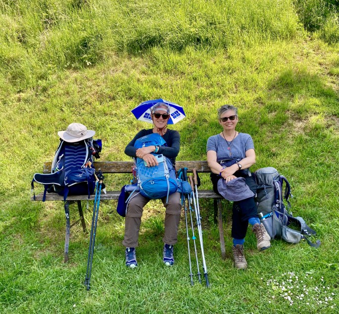 I spy the three Canadian women. With uncanny eyes for locating a bench in the shade, they are comfortably resting. I join them. We are excited. We are laughing. Before she walks ahead of us, Elaine says “France has been great, but it has been almost a1000 kilometers! I’m ready to enter Switzerland!”