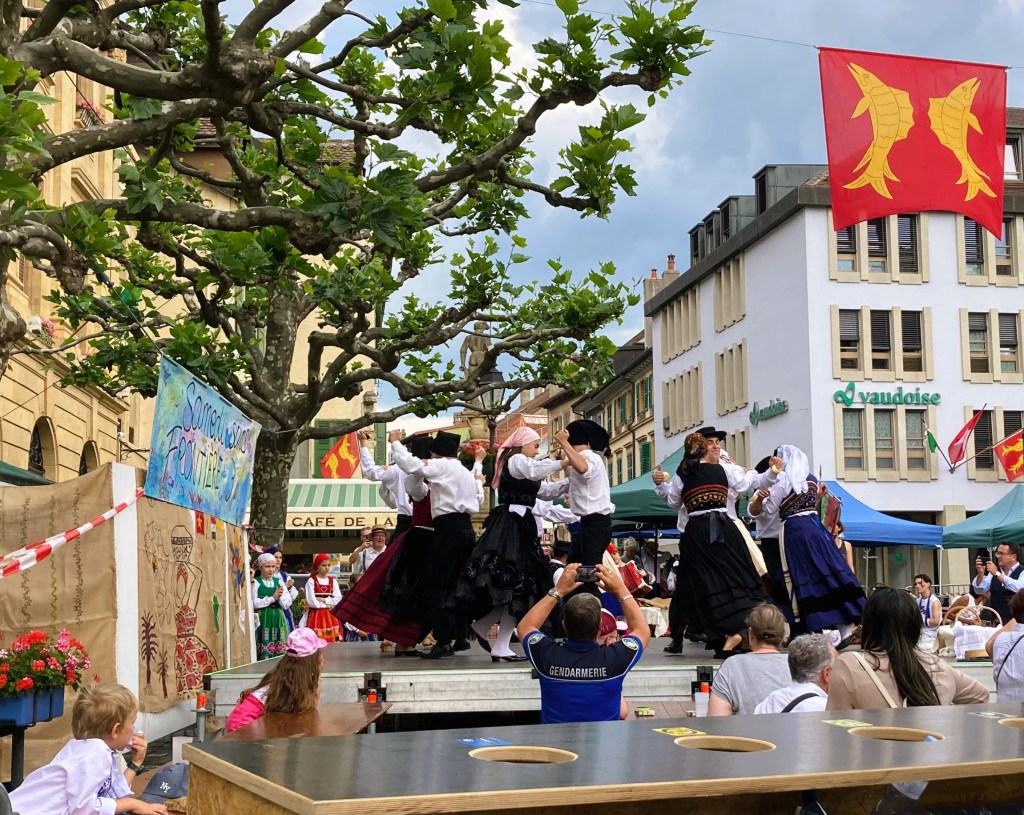 Wait. What do I hear? What do I see? Traditional Swiss music. A dozen or more costumed dancers dancing a traditional Swiss dance! Right in front of my hotel!