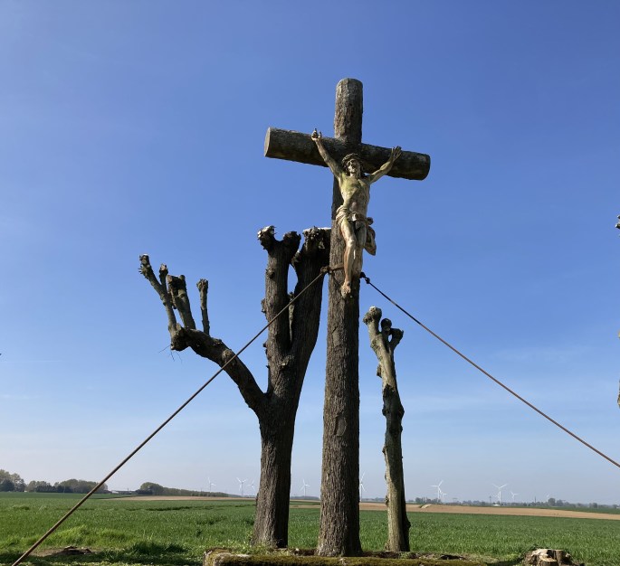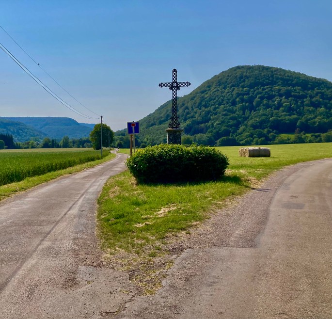 While the weathered markers might look extremely old, most aren’t. Sigeric in the 990’s might have seen some wayside crosses, but I don’t see the same markers. Beyond the few from the late medieval years, most have come from the last 300 years, especially the last 100 years. The older crucifixes were destroyed. Protestants often removed the crucifixes for they symbolized Roman Catholicism and “Popery.” Zealots of the French Revolution destroyed crosses as symbols of outdated superstition propagated by a self-serving church. As a visible way of separating church and state, a 1905 French law prohibited the placement of new crosses or crucifixes on public land. In all these periods, a backlash by French Catholics resulted in many new crosses being displayed. Even now, the S.O. S. Calvaires, a French lay Catholic organization founded in 1987, ambitiously hopes to restore a thousand crosses a year. TThese new crosses are quite simple, often two 4×4’s. While old and innocent looking, the crosses and crucifixes also mark places of tension and conflict.