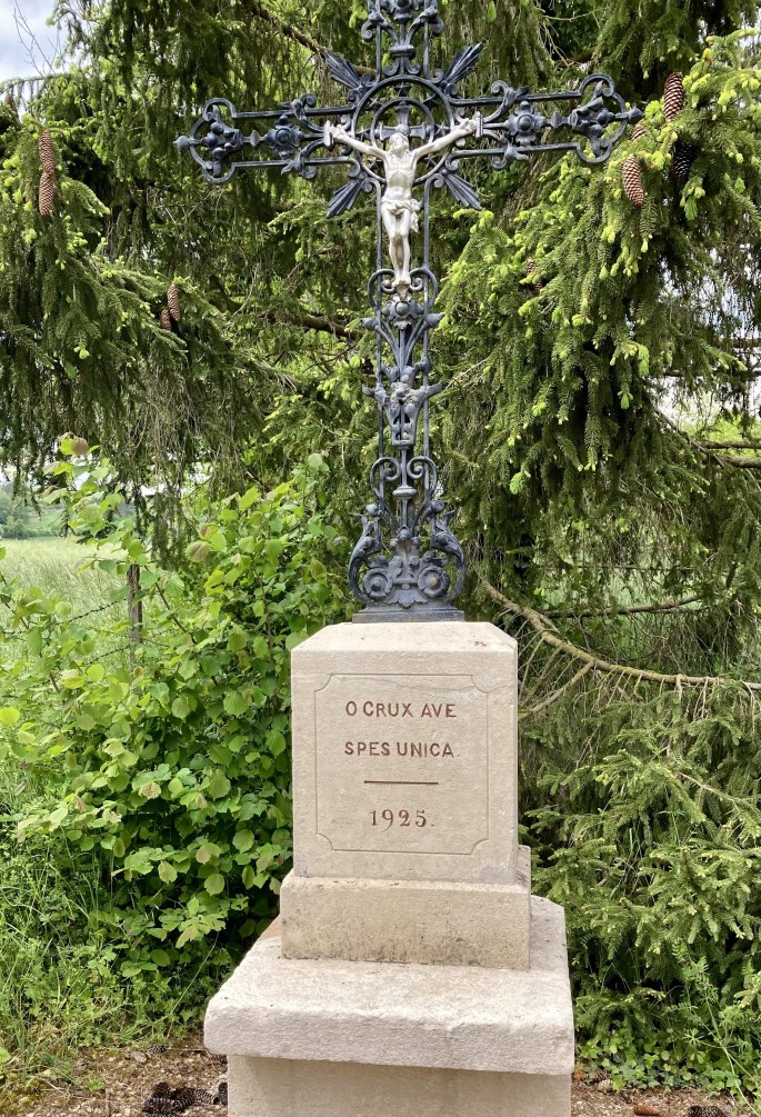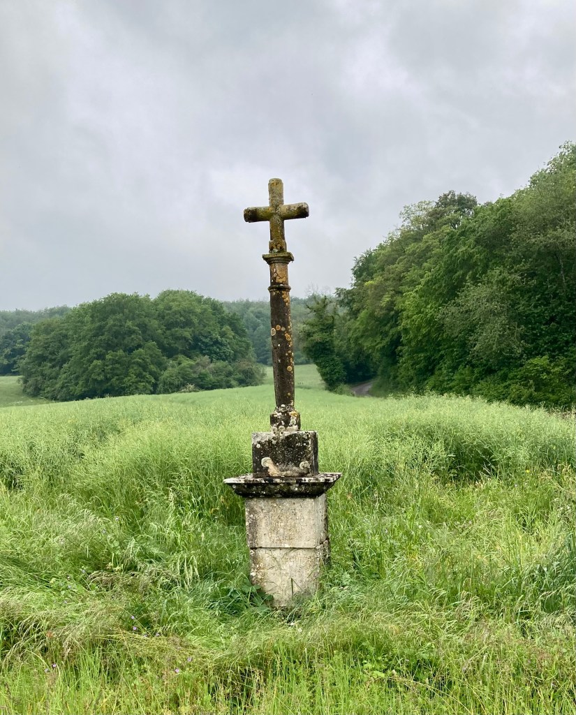 In the French countryside, the primary markers are crosses. I find crosses of various styles: a simple or ornamental cross, passion crosses with some feature of Jesus’ passion (lance, nails, hammer, crown of thorns), and crucifixes. Some are only 2-feet tall; some can be 20-feet tall. The locations as motivated by Christian sentiment are quite varied. Marking an intersection for the benefit of travelers and pilgrims. Marking a nearby abbey or monastery. Marking boundaries between parishes. Marking a holy and sacred site. Marking a site as protected by God. Marking a general location as a means of showing gratitude for some gift of God.