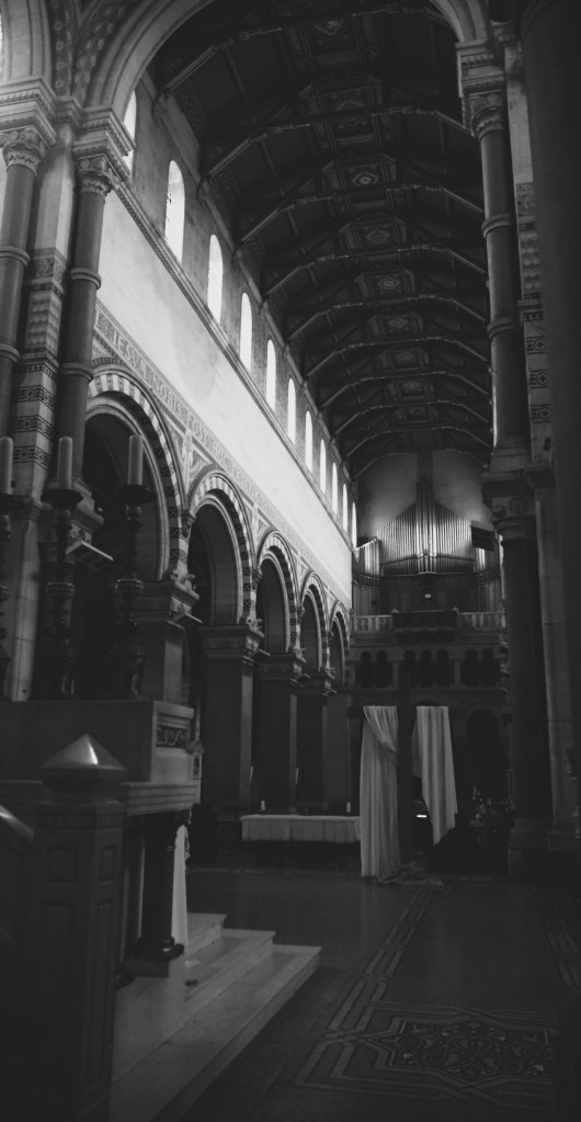 Although I’ve finished walking the Vi Francigena for now, I still hope to write a few more posts. This post simply contains photos that I converted to black and white. The most basic motive for these photos is that I wanted to experiment with a simplifying of compositional elements. The interiors of churches are challenging to photograph. Low light. Unclear focus point. I believe that black and white reduces the liability of low light, allows for the architectural geometry of the church to emerge, and allows a reverential tone for individuals in prayer or for solitary statuary.