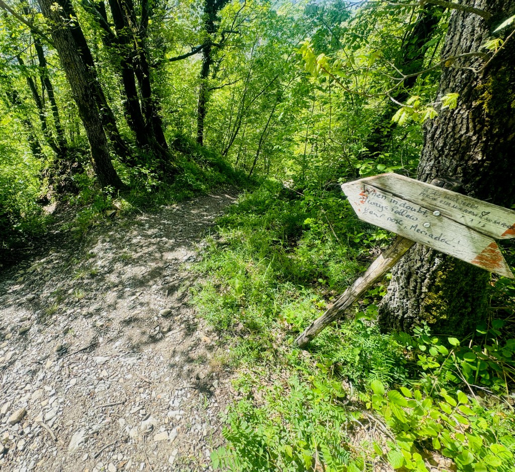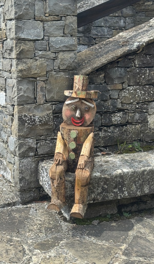 The trail finally levels out. More than simply focused on breathing and finishing the uphill section, the guy upstairs starts noticing the surroundings. Flowers. Local art. And, because the Via Francigena takes you past people’s “backyards” old mowers, plastic chairs, sheds filled with who-knows-what. I can tell the mouth up-above wants to apologize to these folks for seeing their clutter from living.