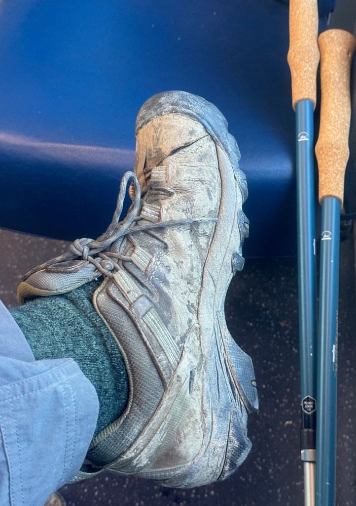 About now, another part of this guy’s body starts to send messages. Two hours of uphill means the pulse rate hits the 130’s. The brain at least had the smarts to buy an iWatch which shows his pulse. He also has the smarts to only walk when his pulse gets back to 100. Smart, but making for very slow pace. Walk 50 feet, rest. Walk 50 feet, rest. Thank God for hiking poles! Those leg muscles right above me are able to get considerable help from the arm muscles. The leg muscles push and lift, the arm muscles pull and steady.