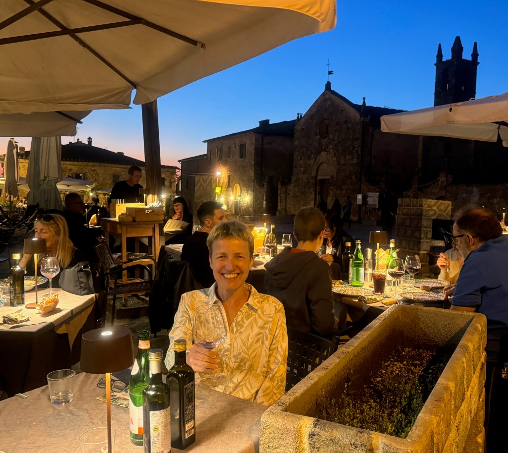 Our paths cross two days later. In the small village of Monteriggioni, population 50, we are both staying in the Ostello. Her room has 5 other pilgrims; my room has 3 other pilgrims. We get a reservation at a restaurant right across from the Ostello.