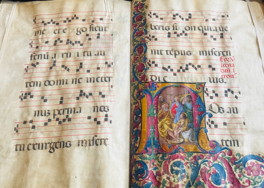Walking into a library attached to the nave, I see more than a dozen medieval, illuminated, large size, choir books. The choir books would make anyone want to sing!