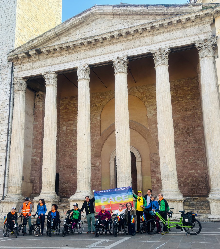 I see Rainbow flags in several cities. Here were cyclists, several in wheelchairs, in Assisi.