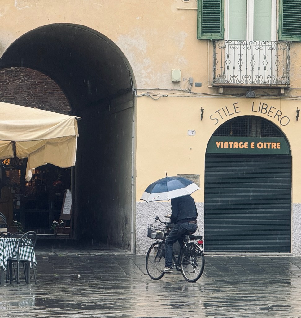 There is a story to this next photo. In a Lucca piazza, I enjoyed taking photos of people. In this case, these two cyclists are admiring the San Frediano Basilica facade.