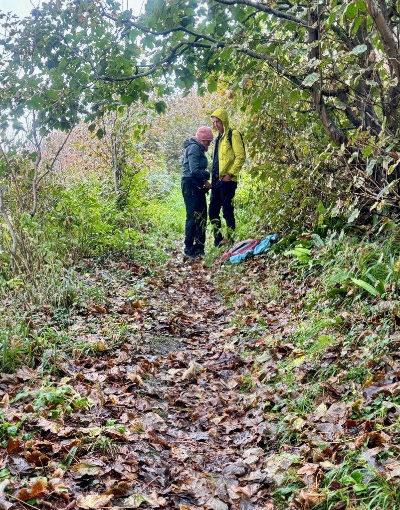 I meet two different couples. An elderly couple is strolling the street, umbrella in use. “Good luck on your walk. A wet one.” Yup. A German hiking couple is leaving town as I am. Following a sign which takes us on a footpath off the main trail, we pause. They put on their rain ponchos. I pull out my iPhone and look at my hiking app. “Dang, off the trail already!”