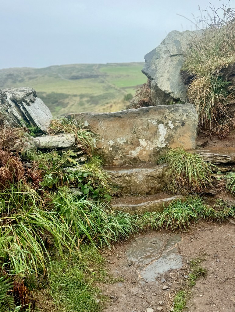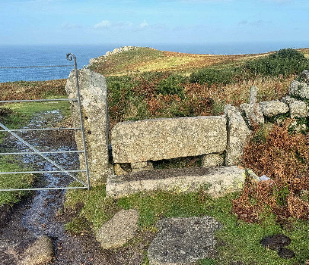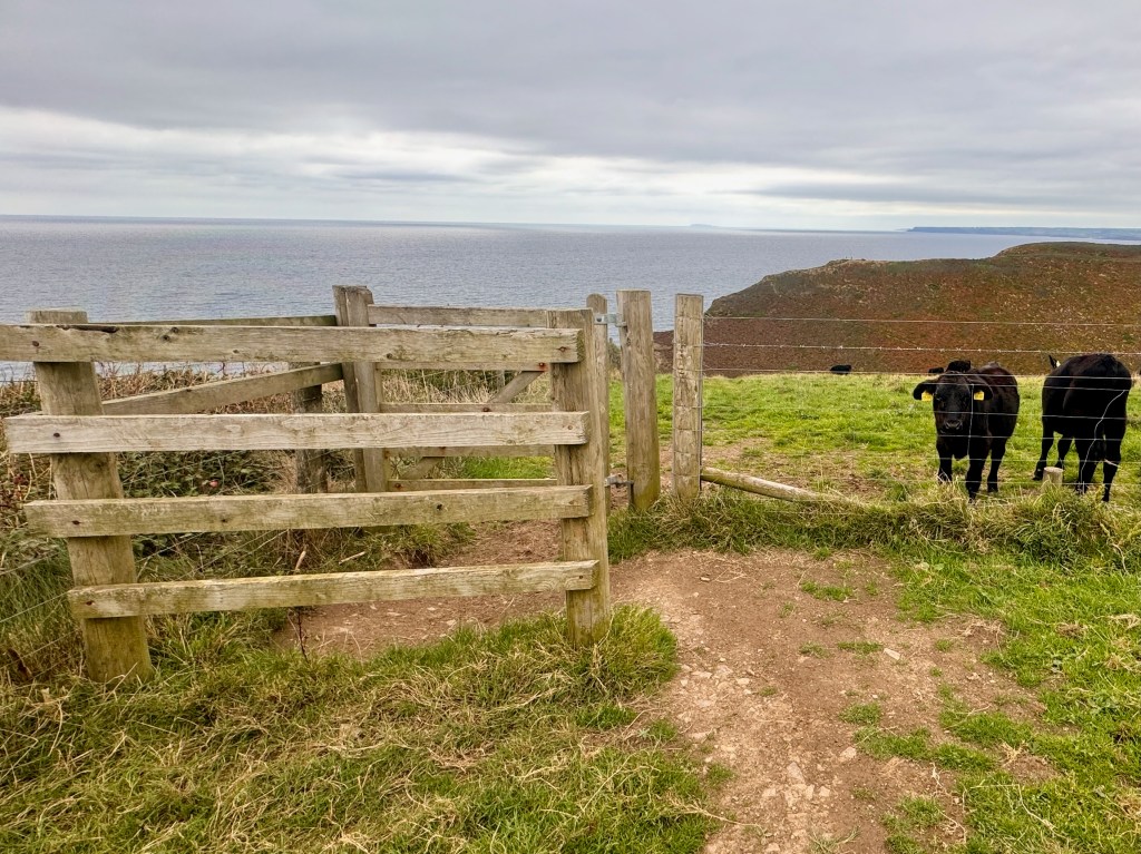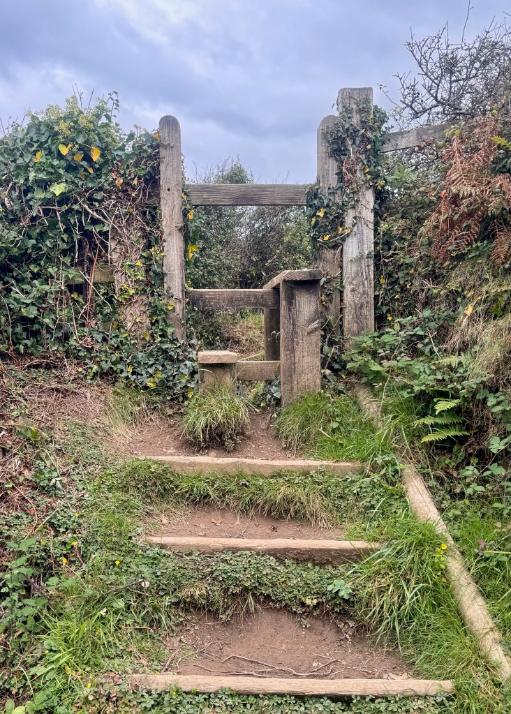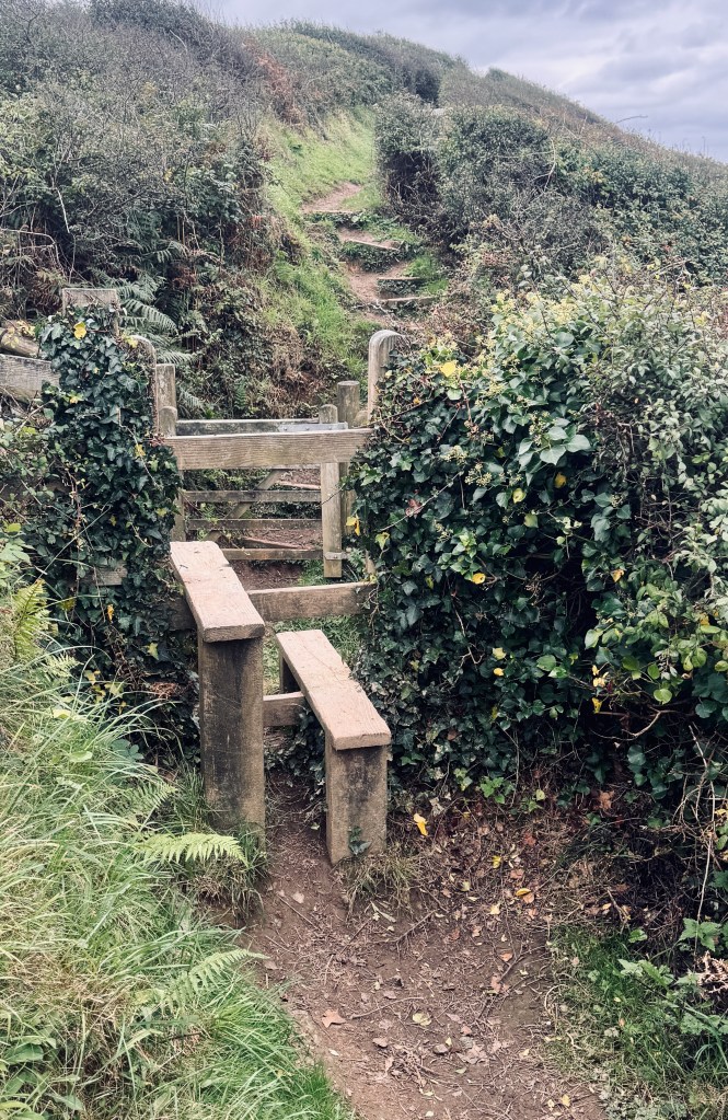 I’m walking. I’m moving through some woodlands and approaching a grassy field. What do I expect, a stile. I don’t expect stiles in France. I don’t expect stiles in Italy. I expect stiles in England because these ingenious portals allow walkers to cross into fields where sheep, cattle, or horses feed, while assuring those animals will stay in the enclosed field. Although I’m only walking half the South West Coast Path now, I’ve read that there are over 400 stiles along the whole path. Yikes!