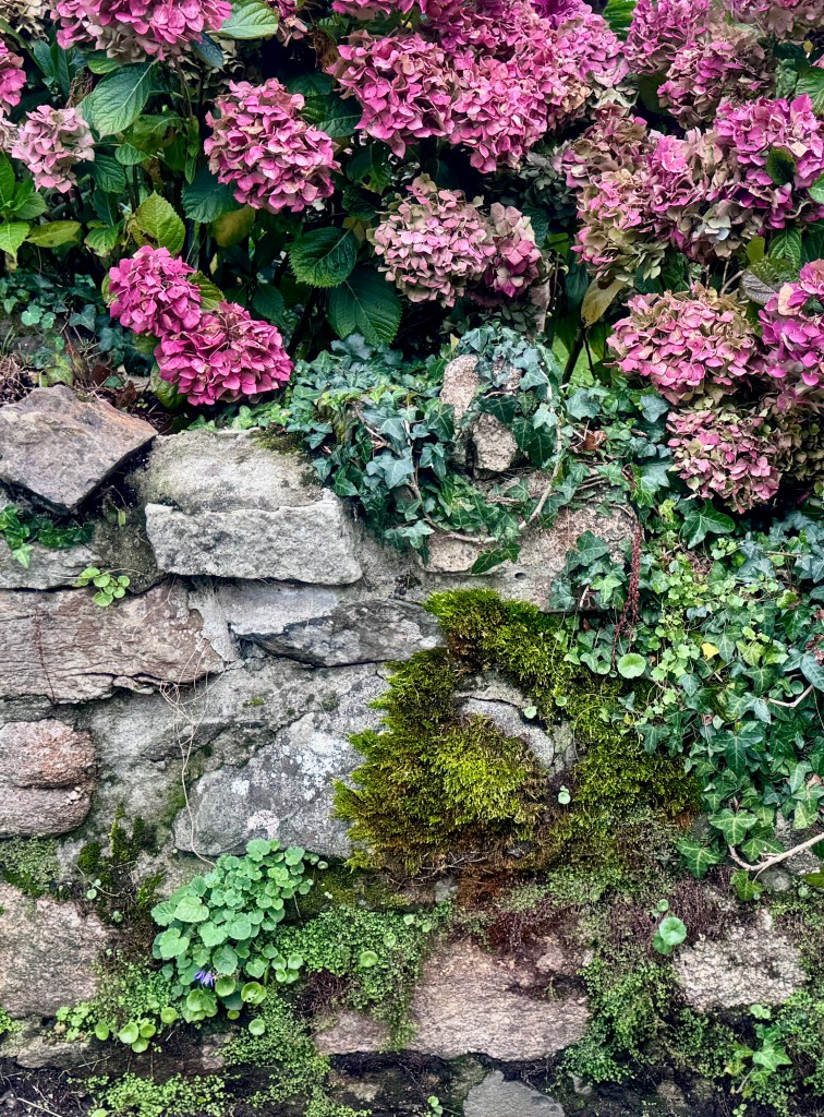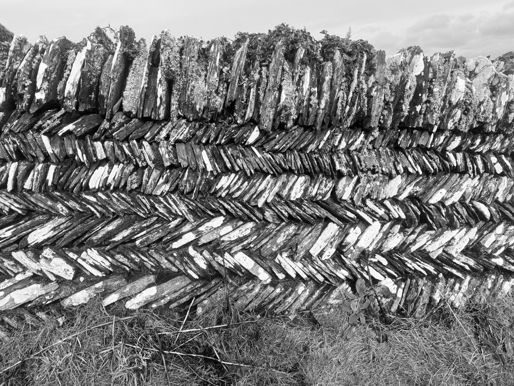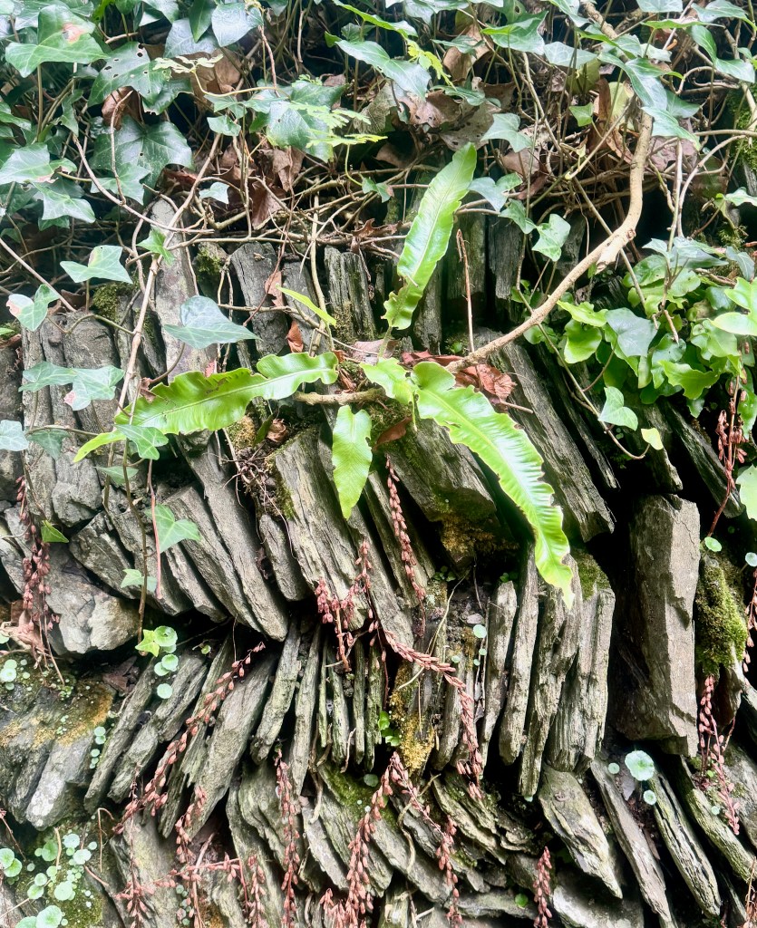 Some of the stones serve practical purposes. The helpful steps. The graceful bridge. The well-placed bench. The dry stacked stone wall. Some stones are horizontal. Some stones are vertical. Some are both horizontal and vertical. The rough field wall enclosing cattle. The stone wall sharing itself with tongue ferns and English ivy. Stone for walls for barns and homes. Even slate on the roofs!