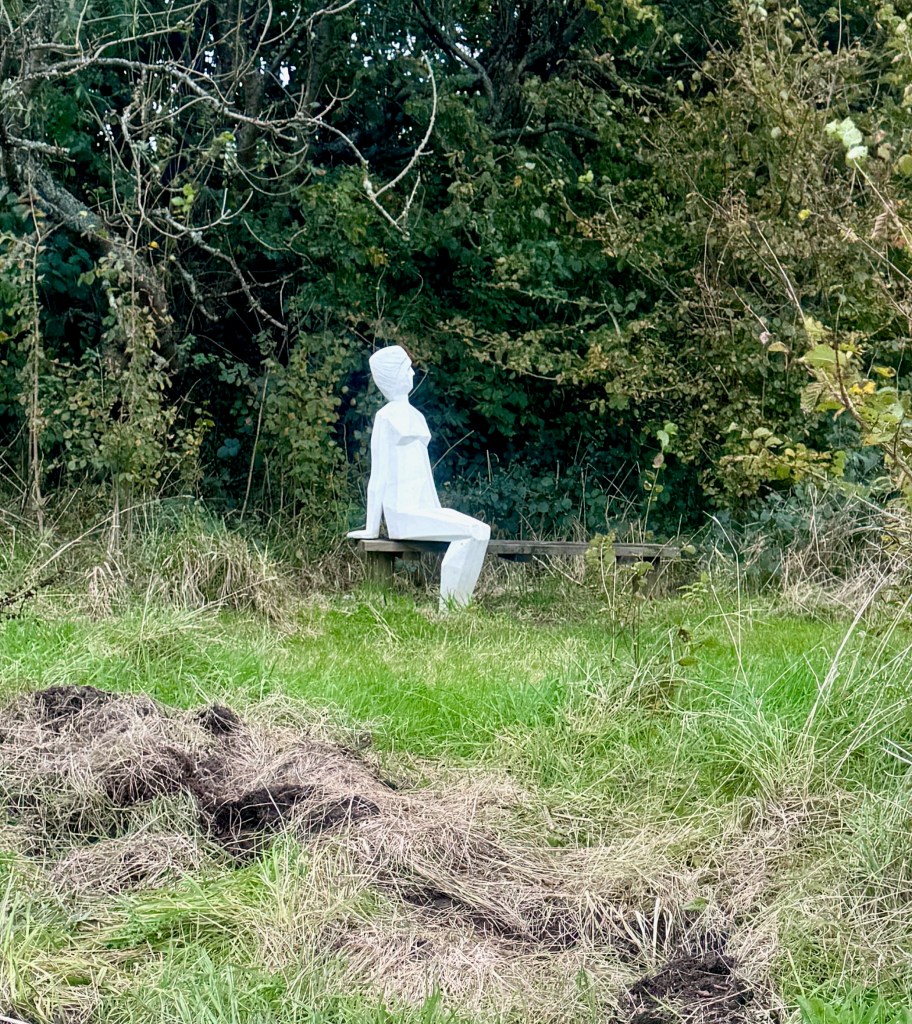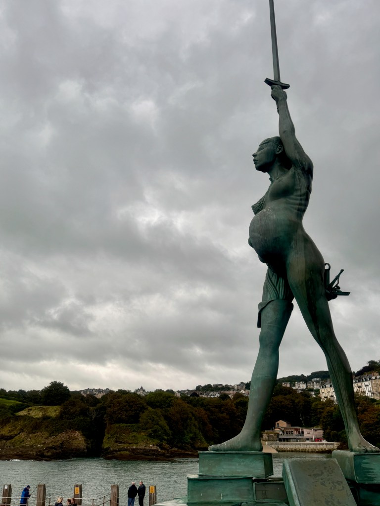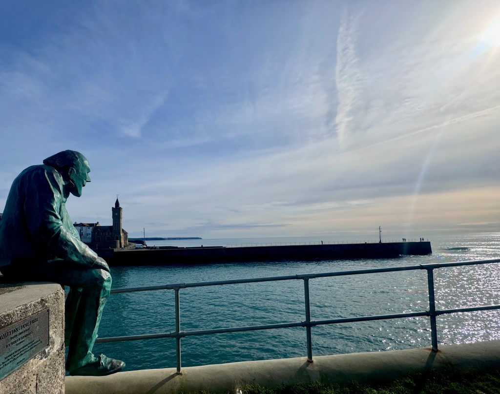 I’m not surprised by the art found along the trail, in gardens, at the pier, or in museums. In Ilfracombe, Verity stands. She is a tall statue of justice standing on law books with the scales behind her back slightly unbalanced. Further south along the coast, around the beginning of the twentieth century, painters especially were attracted by Cornwall’s “light”, similar to Provence attracting Cezanne, Van Gogh, Monet, Gaugin, Matisse, Picasso, and Chagall. While there is no Michelangelo, there are sculptors whose work can be viewed. In Penzance and Porthleven, there are sculptures along the waterfront.