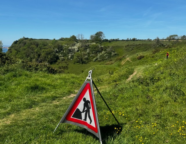 There are times when the path shows that it has had some loving attention or that it needs attention. I’ve learned that May is “path preparation month.” I come upon a young man who is doing contract work fixing a fence and stile for the National Trust. “I love this job. I’m a hiker, and now I get paid to be out on the path every day!” Most of the times, I say to myself when crossing a stream or creek. “A footbridge, how nice!” Sometimes though I get rather judgmental. “Oh, this footbridge is missing a few planks!” Due to the cliffs eroding, some parts of the path have been closed. I can’t imagine walking in the fog or heavy rain on that part of the path! But I know that people do.