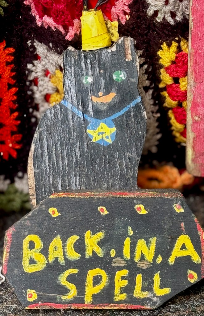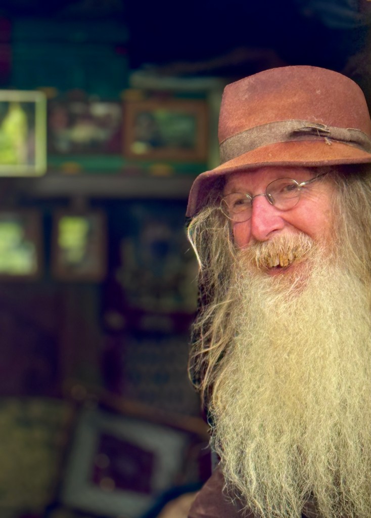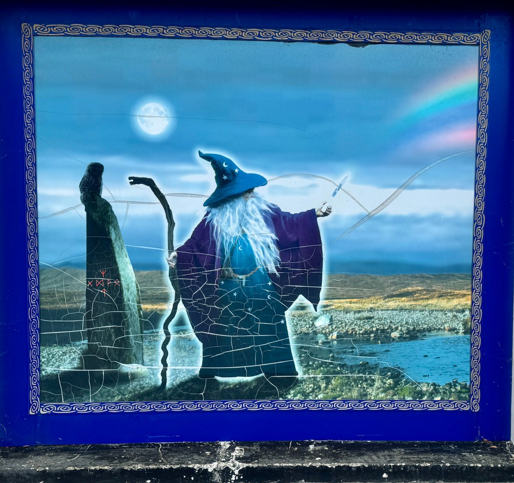Sitting inside his truck, all of his objects to sell on the ground or displayed on the back of his very, very old truck. I stop. I look at the walking sticks he has carved; primitive-drawing signs that he has made; collections of other “cult” objects. We talk. In a gentle voice, he tells me about his service in the Royal Navy; his marriage and then divorce; his friendship with several other “wandering magicians and witches.” “I make it to most of the festivals; at other times, I move around the country. Most places, I can stay about a week, but then I have to move because the authorities don’t want me to stay too long.” The world of the occult has reappeared!
