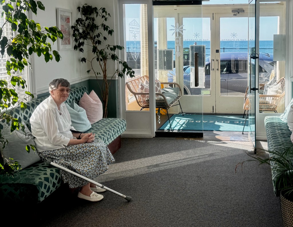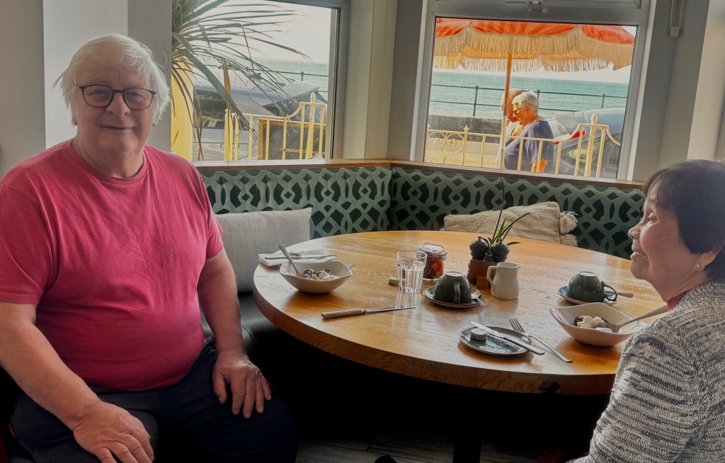 In Sidmouth, the average age must be 70. I meet people walking the promenade along the sea; I meet people sitting in wheelchairs or using walkers; I meet two friends sitting on a bench with their morning drink; I visit with a elderly person and her daughter enjoying the beach.