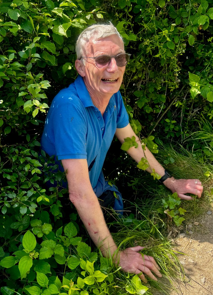 The problem is that there is nothing next to the path. In places, the path is deceptive. Sometimes there is “no shoulder” to move onto. In this case, the man starts to sink out of sight! Moving in slow motion, he disappears into a thicket of brambles and shrubs. Yikes. I’m thinking this man is going to hit the rocks or the beach 100 feet below!