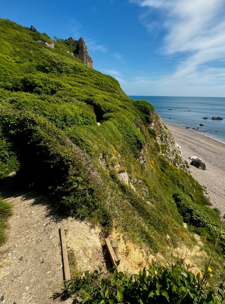 This day’s walk becomes a bit different. I’m walking through the undercliff area. Although the path normally moves to the top of the cliffs, today the path goes through an area between the top of the cliffs and the seashore. The cliffs collapsed 150 years and over time vegetation has grown in this uneven piece of land.