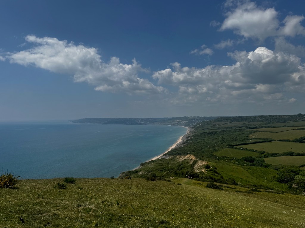 Earlier, as I’m walking, I’m at Seaton. I pass the giant Golden Cap Holiday Park. I start up Ridge Hill. Only 100 yards up the trail, not a super-steep incline, I pass an older fellow. He’s paused and looks a bit befuddled. “Are you okay?” “Oh, yeah, I’m resting a bit, heading down to my caravan.” I continue “another beautiful, but hot day. How you doing?” “Well, I fell back there. I fell backwards coming down one of the steps and hit my head and tore up my arm a bit. When I hit the ground, my glasses flew off. Having bit of a problem making it down the hill without them.” YIKES. I may be projecting, but I’m blind without my glasses! “Well, stay here. I’ll go look for them.”