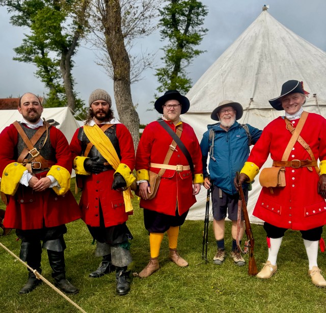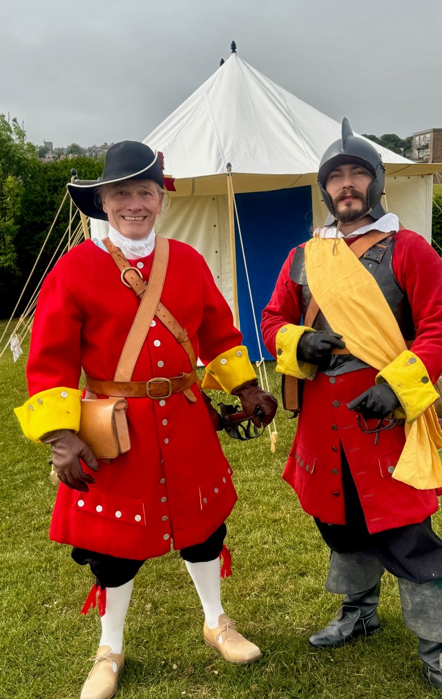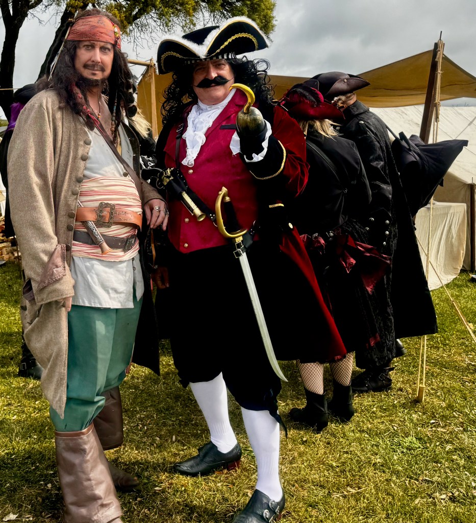 I walk up the hill to a large park-like, green area. A dozen tents with probably twenty or thirty costumed reenactors clusters in small groups, on one side the English militia, on the other side pirates. I approach a smiling and dignified-looking man dressed as an English militia. Rick explains that they represent the local English militia of 1685. Although not the army, Rick proudly describe that these local units often played important roles. When the Duke of Monmouth and his army landed in southern England in order to surprise King James II and seize the throne, the local militias sufficiently slowed his progress that King James II could collect his army to defeat the Duke. Kingsley, his son, soon joins us. “Lots of enactors go for the medieval period, but we love the 1600’s and 1700’s.” Both show me their guns. Rick’s gun is an authentic dragoon gun. Since I had to ask what is a dragoon gun, Rick explained that it was a gun designed for horsemen. “When I dismount, I can hit a target at 100 meters; it just may not be the target that I was aiming for.” Kingsley’s gun is three times as long and heavy. Impressive.