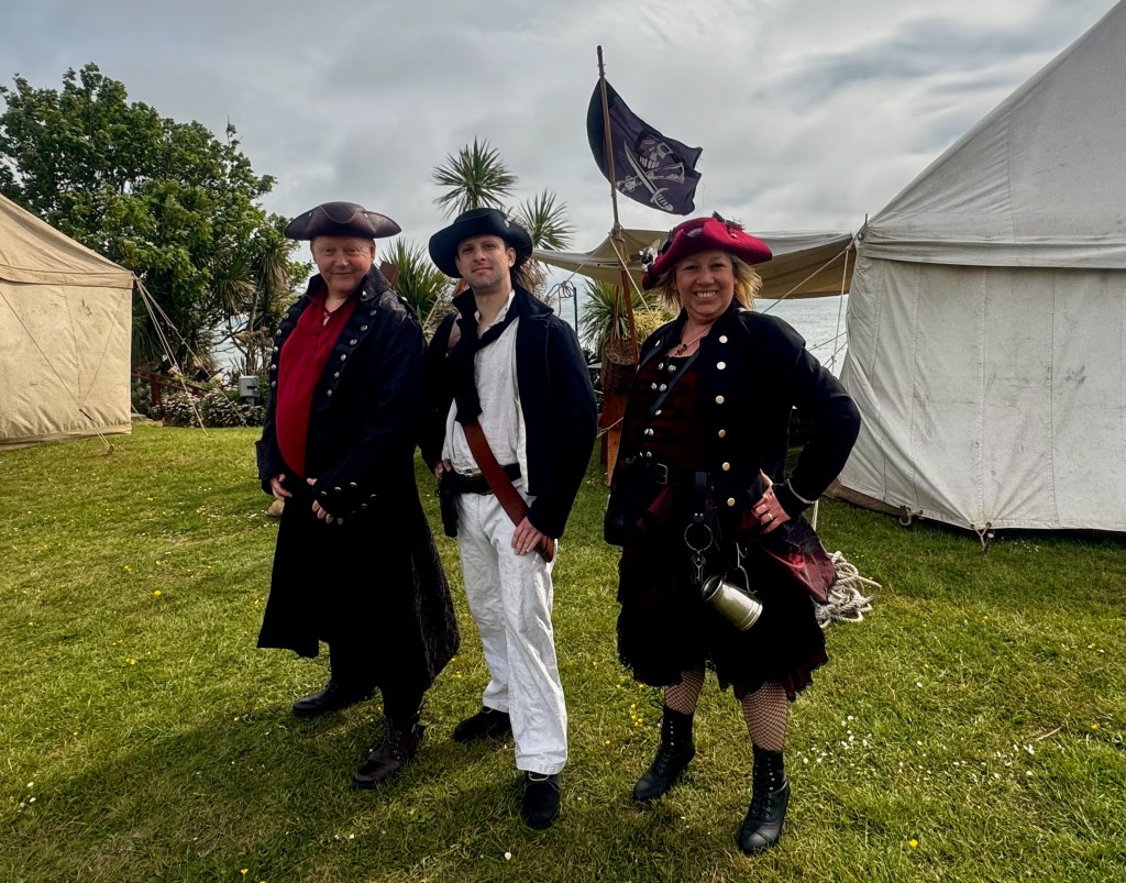 I move down the green to the pirates. The pirates are more diverse with children, young and old women, men with a hook instead of a left hand, and, of course, several Jack Sparrows. “When did you take up pirating?” I ask one Jack. “Well, of course, shortly after The Pirates of the Caribbean came out.” “I even had a friend write a pantomime in which I and others performed in front of school groups. Quite fun.” “Three weeks ago my friends and I were at Brixham. Well, with 30,000 pirates I guess that they weren’t all friends. I and several others were in the rigging of Francis Drake’s The Golden Hind having a dual. Lots of fun.” He explains that if I stick around until noon, then I’ll see the militia and pirates fight on the beach and also watch the militia fire their cannon. Unfortunately, I feel the urge to be on the path and reach my destination. But, what fun. These reenactors live in a world of perpetual Halloweens!