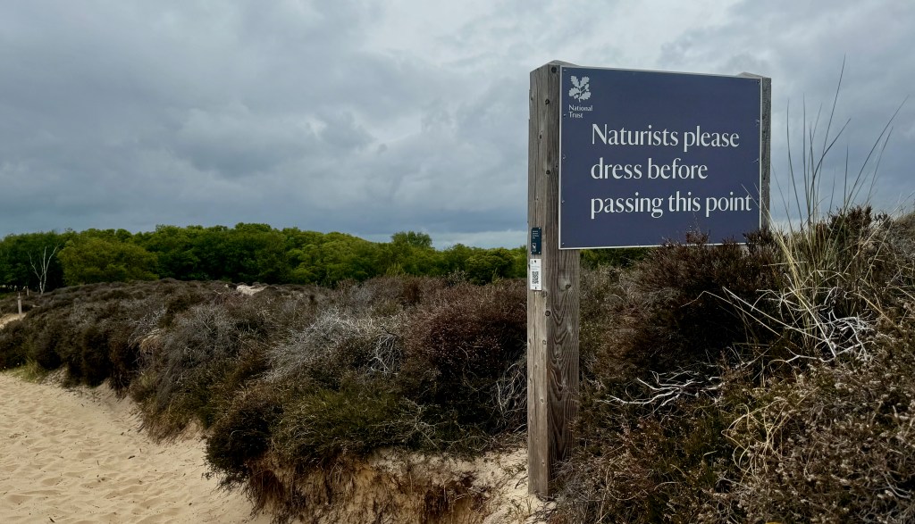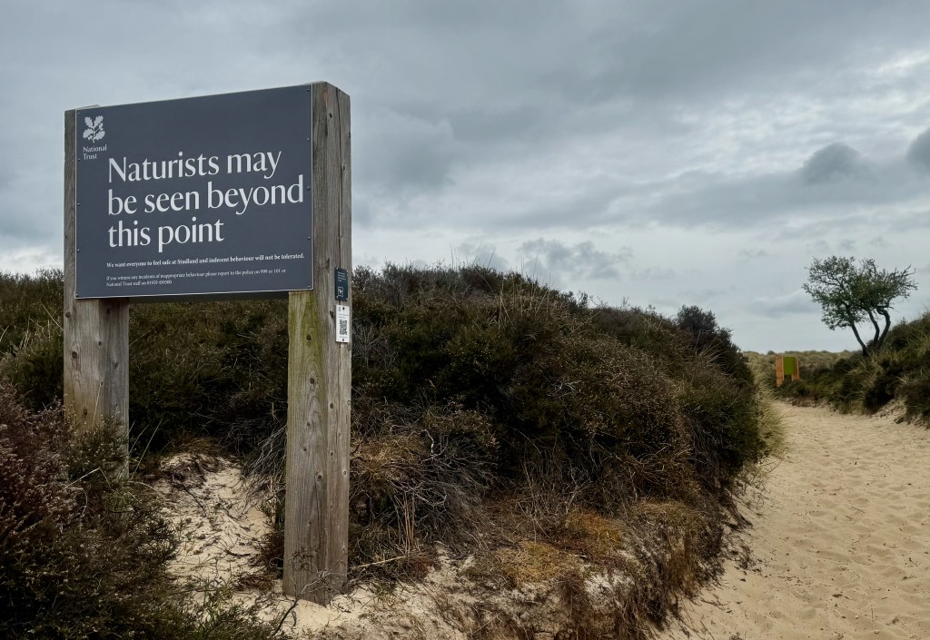 I keep walking. Down from the hills, I emerge onto a sandy beach stretching until the final sign and ferry. Probably three or four miles. For awhile, I walk on the wet sand; however, I eventually have to move slightly inland because the wet sand turns to wet mud. Yuck. I’m minding my own business walking through heather when I come upon a sign: Naturalist Area. While this could refer to an area protected for the local wildlife, this sign isn’t designed to inform the walker to watch out for birds and ducks. I decide not to look to the left and not to look to the right. I keep my head down and look at the ground in front of me for a good twenty minutes. As I pass a sign that gives me an “all clear” meaning, I return to the beach.