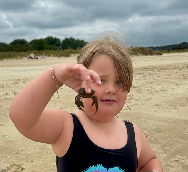 One more photo though. I pass a young girl and the rest of her family. She is quite excited. She has just found a small crab. When I ask if I may take her photo, she proudly and carefully holds the crab in front of her face. Nice!