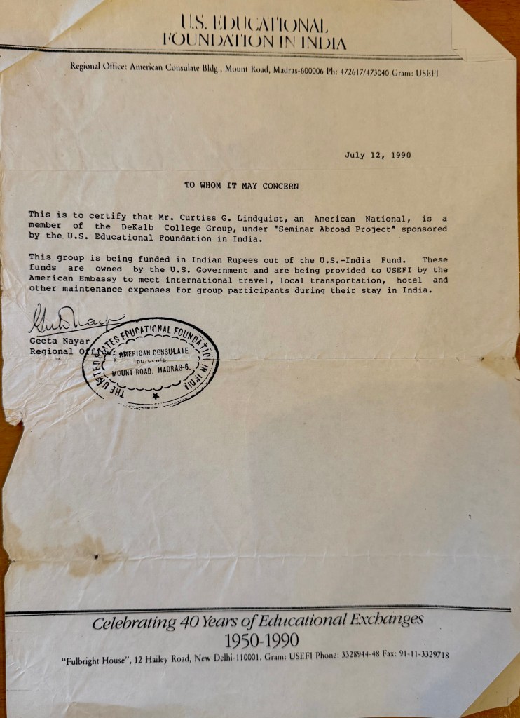 One winter day while using the copier, Carol Dana, a full-time English faculty member asks me: “Would you like to go to India?” “Sure! But what are you talking about?” Carol continued, “DeKalb College received a Fulbright-Hays grant. This US grant pays for academics who are non-specialists in South Asian studies to travel and learn about India. It is an almost six-week seminar which leaves in June. Best yet, all our expenses are covered by the grant!” After talking with Mary, we both agree that I shouldn’t pass up the opportunity.