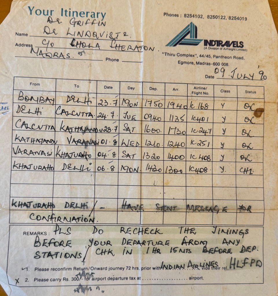 As I mentioned, Carl Griffin and I extend our travels. After bidding the others goodbye, we visit other noteworthy cities. We fly to Kathmandu (Nepal), fly back to India and visit Varanasi, Calcutta (Kolkata), Khajuraho, and then Delhi in order to return to Atlanta. An exhausting but exhilarating trip!