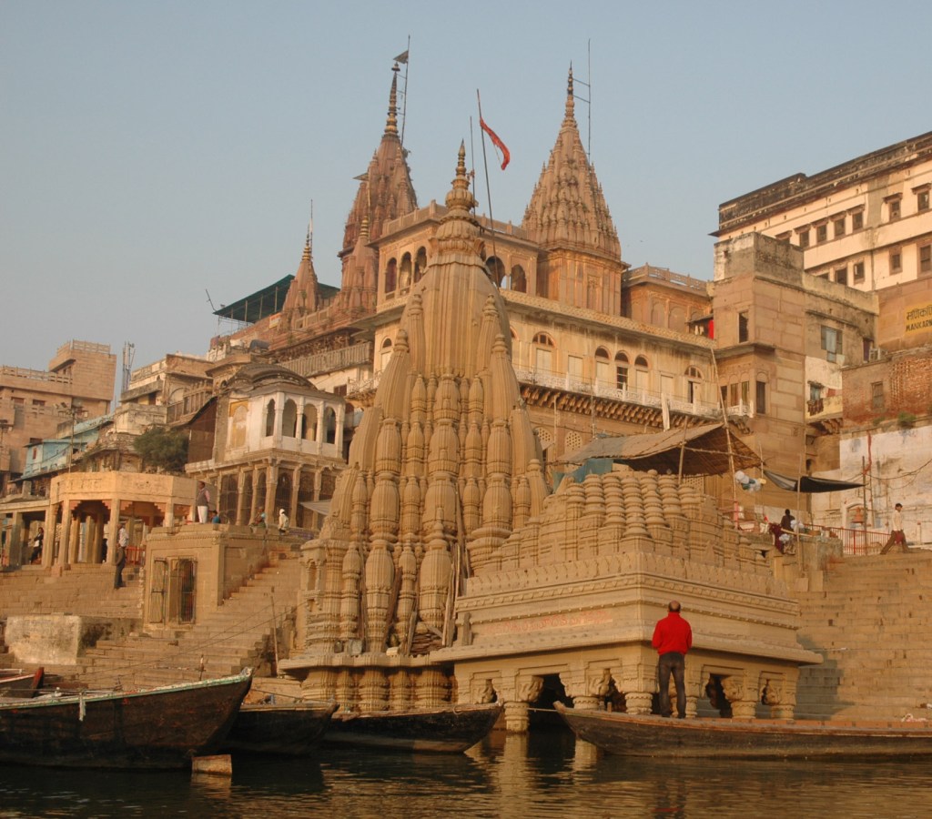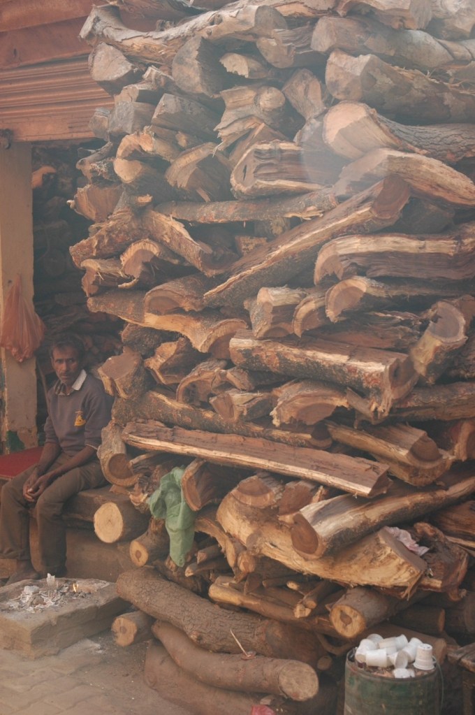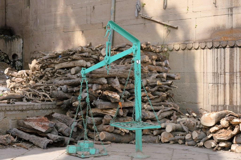 The visits to the Manikarnika Ghat are unforgettable. It is one of the primary ghats for cremation. As we walk from the alleyways and not along the ghats, we see stacks of wood and scales. As a precious commodity, the wood must be imported to Varanasi. The more expensive the wood, the more expensive the cremation costs.