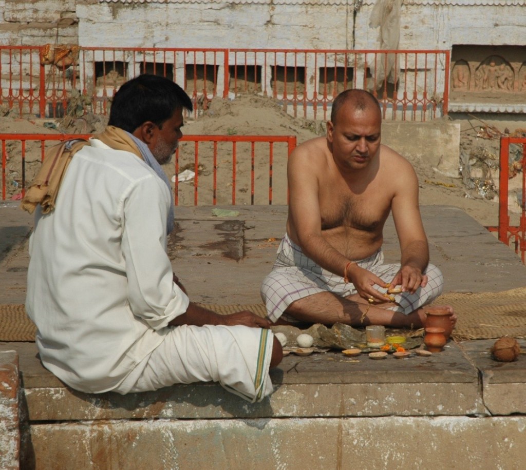 Priests proudly sitting underneath large umbrellas waiting for persons to pay for a recitation of Vedic prayers. During our visits, we don’t see many westerners. We do catch a conversation between one western college-age young man and a police officer. He is explaining to the police how his boat had capsized. Neither he nor anybody else on the boat drowned; however, he had lost his backpack. For all of us, the Ganga acted as a magnetic force pulling us toward the river, over and over again.