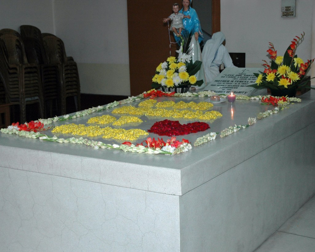 The Mother House is not an imposing structure. Before entering the building, I am surprised by a sign “Do not remove shoes.” As a sister welcomes me, she sees that I’m reading the sign, “Unfortunately, people who left their shoes outside have had their shoes stolen.” After entering and pausing in a large open area, I am shown to the right. Underneath a large concrete tomb, Mother Teresa is buried.