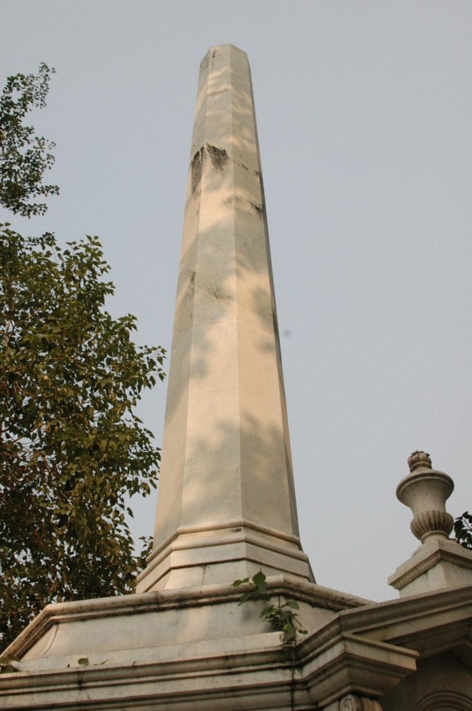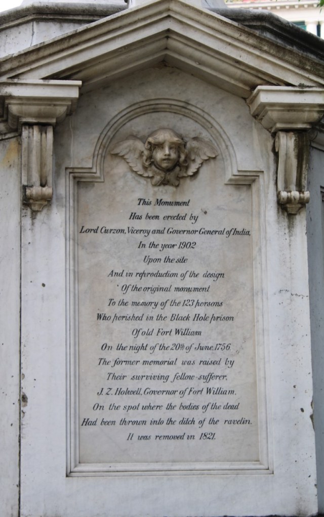 In the church’s cemetery, there is the Holwell Monument, or the “Black Hole” memorial. The backstory is that the local Bengali ruler got angry at the English traders for fortifying their Calcutta “fort” or “factory.” The ruler attacked and captured the fort on June 20, 1756. As the surviving English and numerous Indian sepoys were gathered in front of him, John Holwell, a East India Company employee and the temporary governor of the fort, complained about his hands bound in chains. The ruler ordered that Holwell’s hands be untied; the ruler also guaranteed that nobody would be harmed. The ruler left and authorized one of his commanders to remain in charge of the fort and prisoners. Unfortunately, the situation changed by later in the day, possibly due to an English trader harming a guard. As a result, the prisoners were herded into the fort’s “prison”, a cell 18 ft by 14 ft with only one window. By the next morning, 40 individuals had suffocated from the heat.